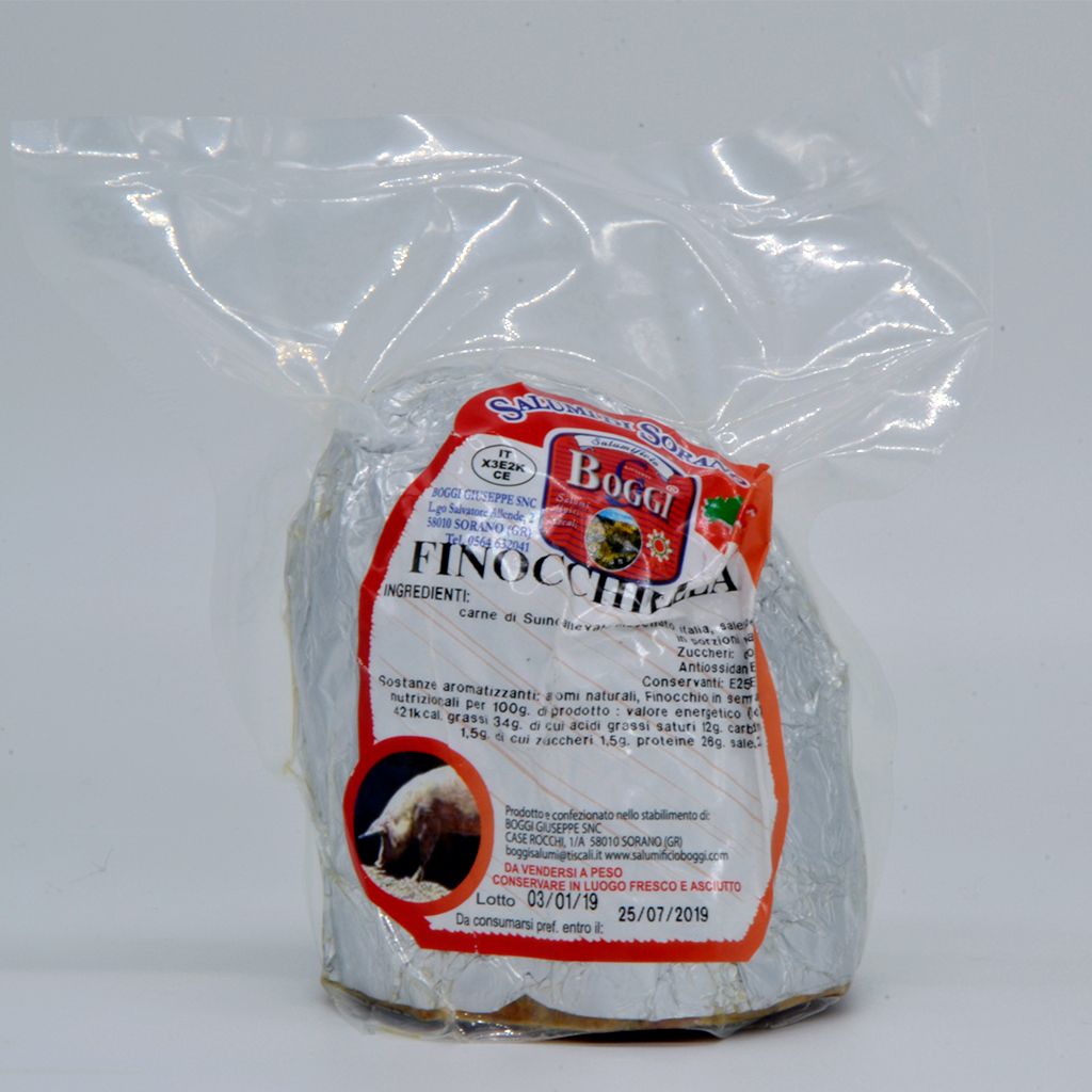 Salame al finocchio: Valore energetico per 100g: 421kcal - Grassi: 34g di cui acidi grassi saturi 12g Carboidrati: 1,5g di cui zuccheri 1,5g; Proteine: 26g Sale: 2,0 g.